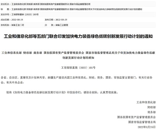 2022年8月24日,為深入貫徹落實(shí)黨中央、國(guó)務(wù)院關(guān)于碳達(dá)峰碳中和的重大戰(zhàn)略決策,推進(jìn)能源生產(chǎn)清潔化、能源消費(fèi)電氣化,支撐新型電力系統(tǒng)建設(shè),加快電力裝備綠色低碳創(chuàng)新發(fā)展,工業(yè)和信息化部、財(cái)政部、商務(wù)部、國(guó)務(wù)院國(guó)有資產(chǎn)監(jiān)督管理委員會(huì)、國(guó)家市場(chǎng)監(jiān)督管理總局聯(lián)合...